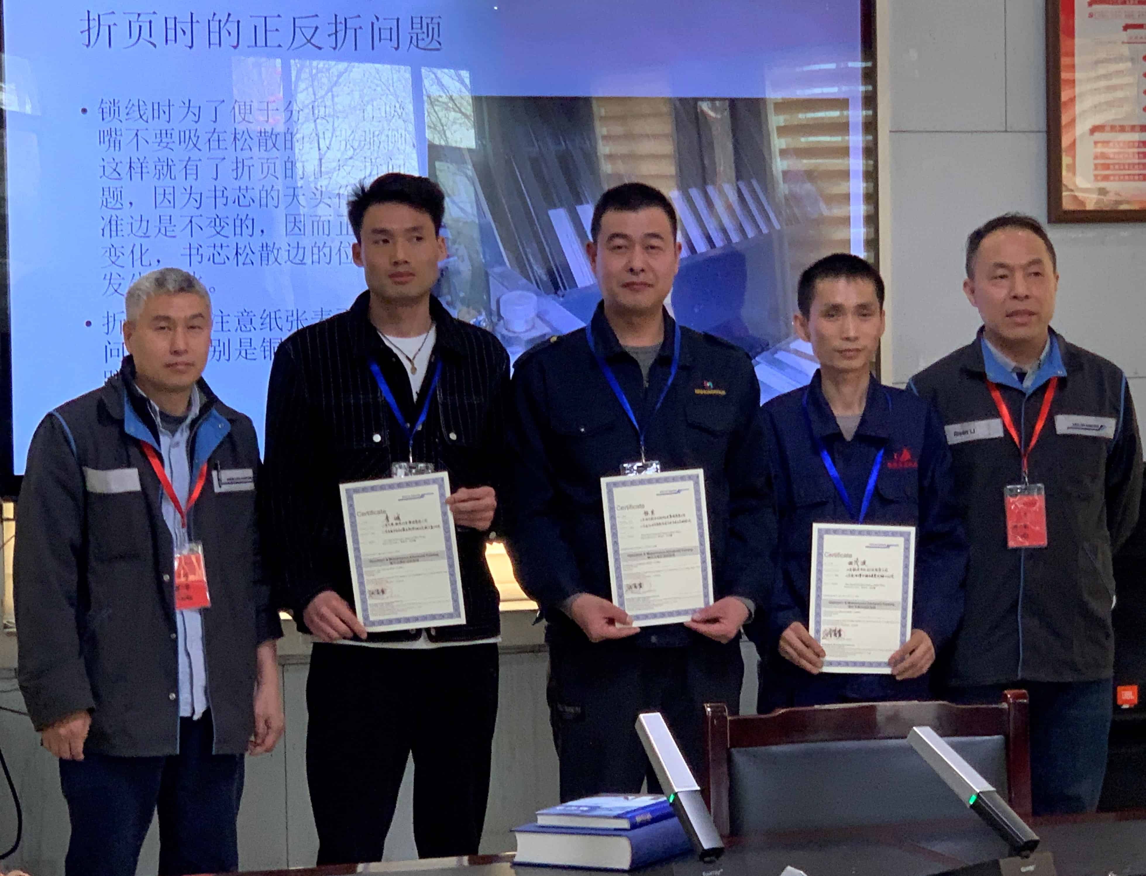 Neben der Hardcover-Schulung besuchten einige Teilnehmer auch einen Spezialkurs zu Betrieb und Wartung von Müller Martini-Maschinen, der von Müller Martini-Ingenieuren aus Europa und China unterstützt wurde. Diejenigen, die alle Anforderungen erfüllten, erhielten ein Zertifikat “Operation & Maintenance Advanced Training” für die Buchlinie Diamant MC 60.