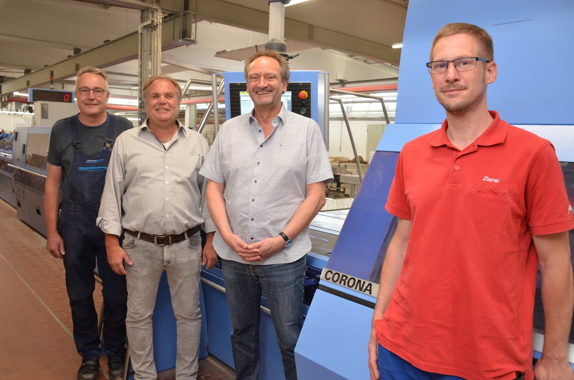 From right: Manuel Zierer (Deputy Department Head Appl Machine and Workshop Availability), Alfred Mühlbauer (Authorized Signatory/Head of Finishing at Appl), Stefan Schwartz (After-Sales Manager at Müller Martini Germany), and Peter Bauer (Technician at Müller Martini Germany) in front of the youngest Corona C15 at Appl.