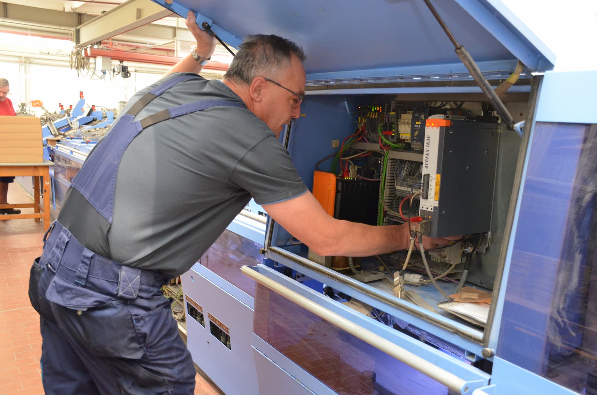 One by one, the operator panel was replaced, first on the core binder, then on the Orbit three-knife trimmer, and finally on the gathering machine 3697 – which also got a new main computer. These parts were all replaced as a precaution. All four of the elements replaced on the three machines were still working, but: you never know. Another benefit: The operator panels replaced on the youngest machines can be used as a backup or installed in older machines of the same type.