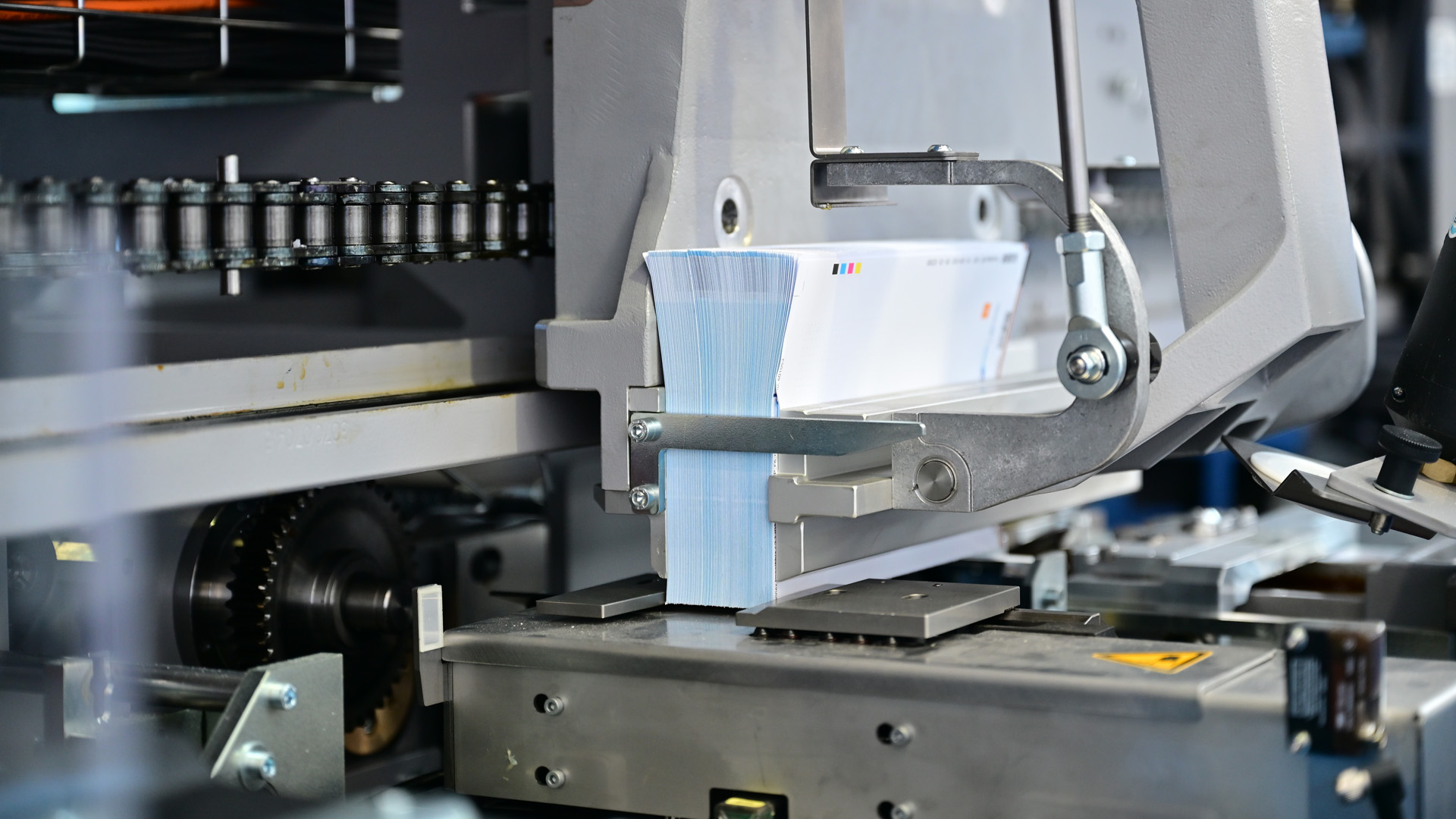 The Antaro Digital produces with a continuously running swivel clamp system. The book blocks are transported in horizontally, standing on their spines and are reliably retained by the six clamps, which are always fully open. Furthermore, the large clamp pitch of 610 mm ensures the continuous production of brochures with a block thickness variance of up to 20 mm. The thicknesses are always changed over fully automatically.