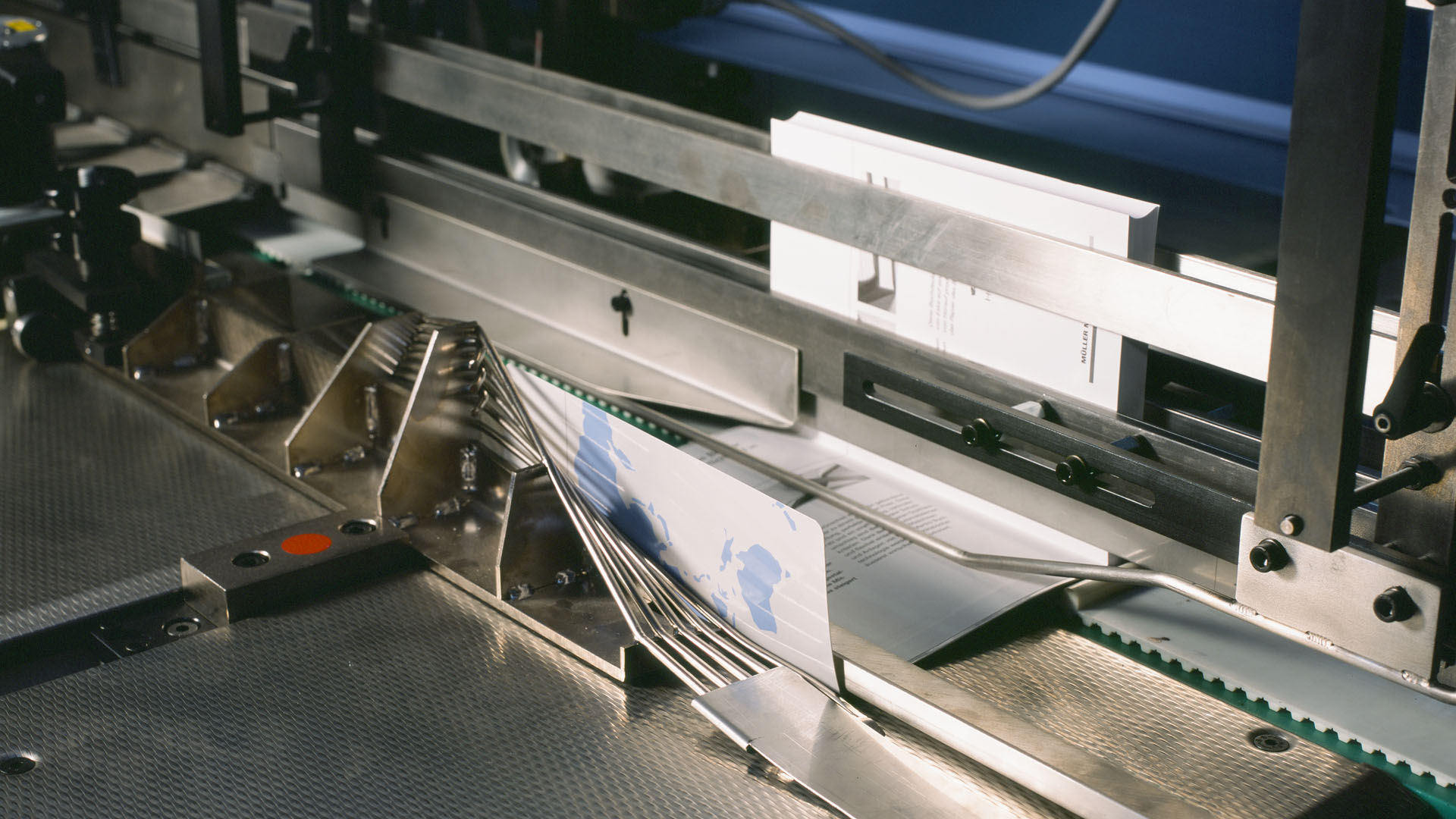 Die patentierte Vorsatzrückführung sorgt für die Rückführung von eventuell beim Öffnen miterfassten Buchseiten, wodurch der Schutzumschlag ausschliesslich um die Buchdecke umgelegt wird.