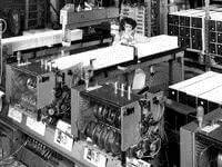 Vier Jahre später folgt der weltweit erste Broschüren-Sammelheft-Vollautomat BSV (4000 T/h), der Anleger, Heftmaschine und Dreischneider erstmals koppelt. Die wegweisenden “fliegenden Heftköpfe” – Hans Müllers Patent der mitlaufenden Heftköpfe, die ohne “Stop and Go” heften – kommen 1956 zum ersten Mal zum Einsatz.