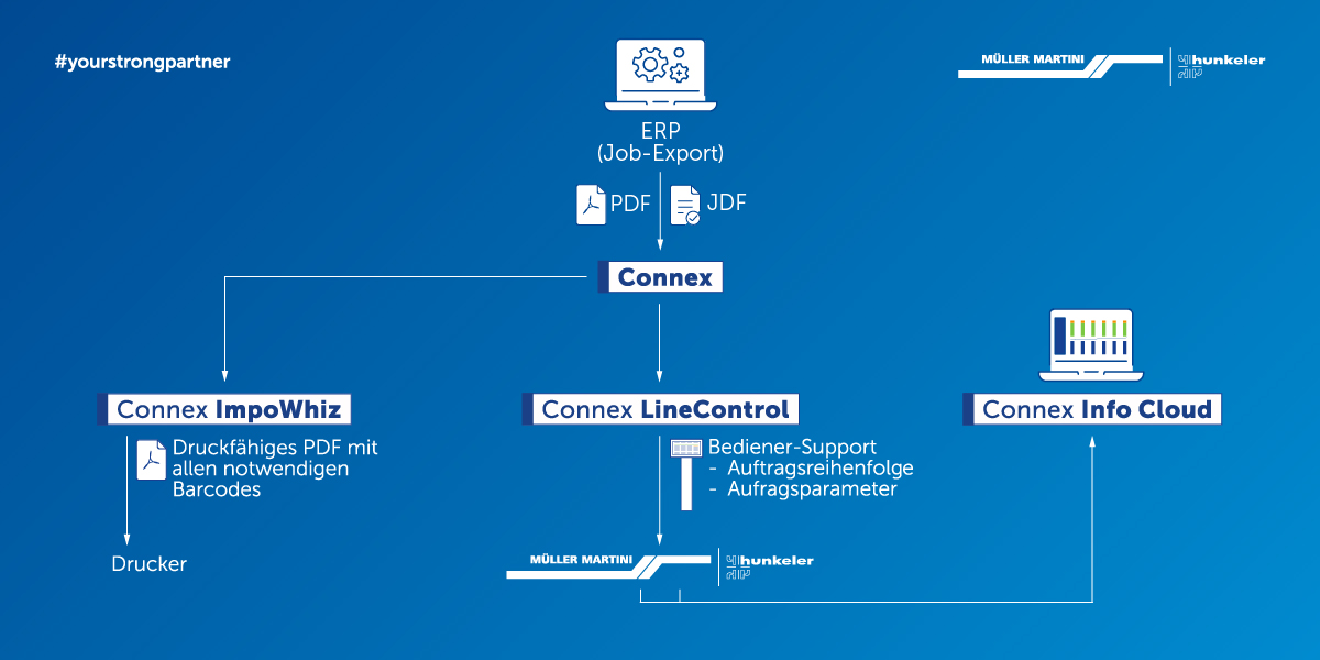 Das Workflow-System Connex ermöglicht durchgängige und vollintegrierte Smart Factory-Lösungen mit Maschinen von Müller Martini und Hunkeler. Mit seinen drei Modulen Connex ImpoWhiz (schnelles und automatisches Ausschiessen), Connex LineControl (Verwaltung von Jobs und Auftragsreihenfolgen) und Connex Info Cloud (Live-Überwachung und -Analyse) kommunizieren Maschinen nahtlos miteinander und können vollständig in das Kundensystem eingebunden werden.